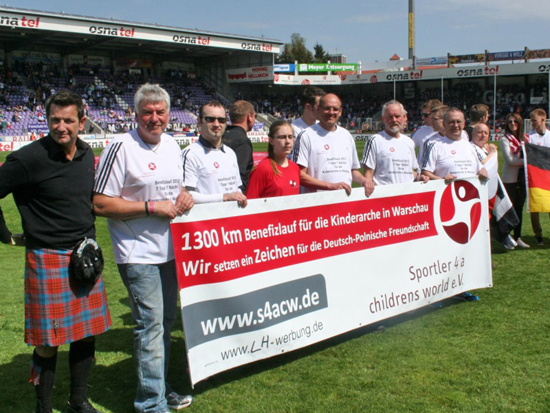 Wie im vergangenen Jahr führte uns unser Benefizlauf auch zum VfL Osnabrück. Am 28. April nutzten wir die Gelegenheit, beim letzten Heimspiel auf den anstehenden Lauf zugunsten einer Arche in Warschau aufmerksam zu machen. Bei strahlendem Sonnenschein ließ es sich der VfL nicht nehmen, mit einem 2-1 Sieg gegen den Aufsteiger aus Sandhausen für fröhliche Gesichter zu sorgen.